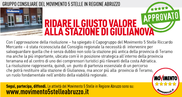Approvata la risoluzione presentata da Riccardo Mercante, al fine di ridare il giusto valore alla stazione di Giulianova, la più antica della provincia di Teramo. Con l’approvazione della risoluzione – ha spiegato il Capogruppo – è stata riconosciuta dal Consiglio regionale la necessità di intervenire per salvaguardare quella che è senza dubbio non solo la stazione più antica della provincia di Teramo ma anche la più importante, ubicata com’è in posizione strategica all’interno della provincia teramana ed al centro di uno dei comprensori turistici più rilevanti della costa Adriatica. La risoluzione rappresenta, quindi, un punto di partenza essenziale di un percorso che potrà restituire alla stazione di Giulianova, ma ancor più alla provincia di Teramo, un ruolo fondamentale nell’ambito della viabilità regionale.