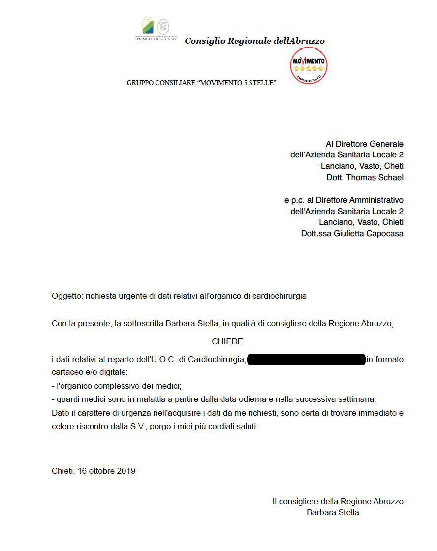 “La richiesta, che ho personalmente inoltrato, alla Direzione Generale della Asl Lanciano, Vasto, Chieti in merito ai dati dell’organico complessivo dell’UOC di Cardiochirurgia e dei medici assenti per malattia dal giorno 16 ottobre fino alla settimana successiva, non ha avuto alcun riscontro. Ritengo inaccettabile un simile comportamento, che non consente di fare luce, a me e a tutti i cittadini abruzzesi, su una questione seria quale l’ipotizzata assenza dal reparto di un consistente numero di medici. Il fatto che non sia stato dato seguito a questa richiesta, giunta tramite PEC, e che non venga fornita alcuna risposta a un Consigliere regionale, non può passare sotto silenzio”.
