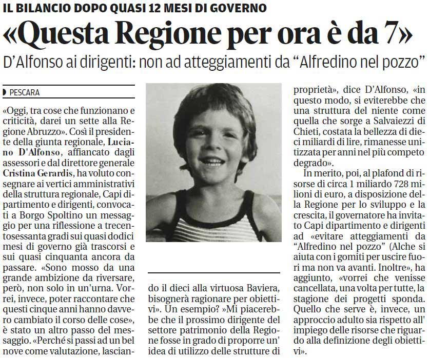 E’ inaccettabile la dichiarazione del Presidente Luciano D’Alfonso che classifica un atteggiamento di chi “non va avanti” come quello di “Alfredino nel Pozzo”. Un paragone infelice proprio dal Presidente delle lunghe orazioni in sede di Consiglio e che più volte si è permesso di bacchettare i consiglieri dell’opposizione per degli infelici, a suo dire, termini.