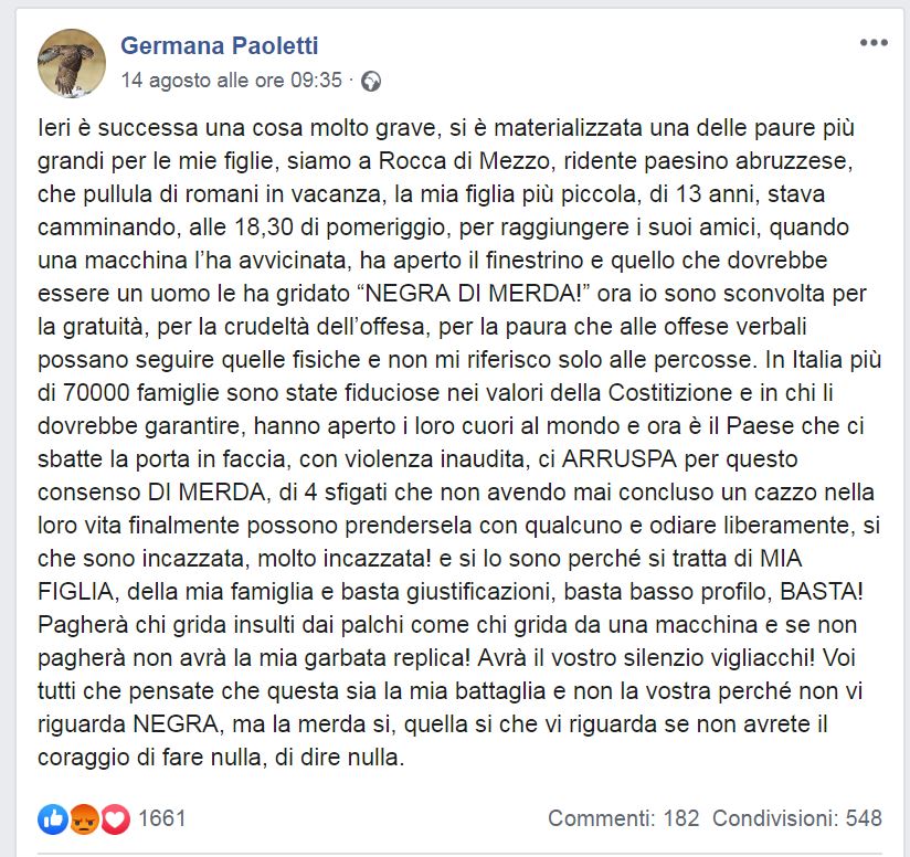 “L’Abruzzo non è razzista e tutti i turisti da noi sono i benvenuti. Ciò che è successo a Rocca di Mezzo non rappresenta il pensiero del popolo abruzzese ma evidenzia solo l’ignoranza di qualcuno” così il Capogruppo M5S in Regione Sara Marcozzi, che continua “L’Abruzzo è ben altro e spero che Germana Paoletti e la sua famiglia, a cui va tutta la mia solidarietà, possano scoprirlo trascorrendo una serena vacanza nella nostra regione”. Conclude.